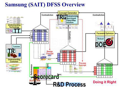 例如,三星在當(dāng)時(shí)比較先進(jìn)的等離子平板顯示器的等離子電極的改進(jìn)上,使用DFSS中的萃思原則(一種關(guān)于發(fā)明問題的理論,詳見TRIZ),將傳統(tǒng)三角形突出電極改為平面電極,降低了制造精度的要求,顯著減少殘次品率,同時(shí)提高變異效應(yīng)40%. 三星對DFSS的導(dǎo)入并不是全面鋪開,而是以DFSS方法集合中的Triz萃思作為突破口。三星在早期萃思導(dǎo)入的幾個(gè)項(xiàng)目上的投入超過1億美元,三星集團(tuán)的每一個(gè)公司、每一家工廠,都有一個(gè)萃思小組。