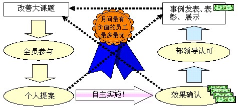 改善最開始的時候可以不完全以經濟目的為重,隨著改善的推進逐漸把經濟目標作為一項改善要求,確認其有形的財務效果,經過部門領導的認可后,將事例發表和展示出來,并對當月最有價值的員工進行表彰,過程如圖所示。