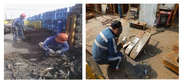 ♦ 井下回收上來的水管吊掛鏈及水管卡子螺栓銹蝕嚴(yán)重,在井下無法分離,回收組組織進(jìn)行用氣割將其連接處割開,將鏈子和水管卡子分類碼放,以便再用