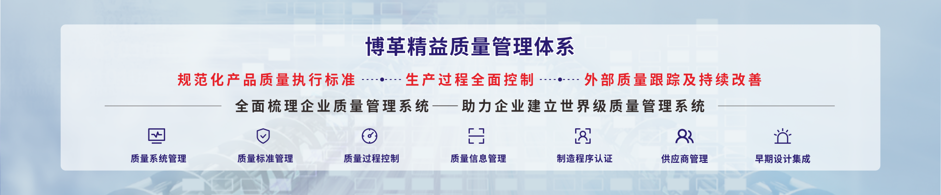博革咨詢的精益質(zhì)量系統(tǒng)包含了質(zhì)量系統(tǒng)管理、質(zhì)量標(biāo)準(zhǔn)管理、質(zhì)量過(guò)程控制、質(zhì)量信息管理、制造程序認(rèn)證、供應(yīng)商管理、早期設(shè)計(jì)集成7大部分內(nèi)容,博革咨詢通過(guò)精益質(zhì)量系統(tǒng)的診斷和流程優(yōu)化,將幫助企業(yè)梳理在質(zhì)量管理理念、工具方法、流程平臺(tái)、質(zhì)量專家和質(zhì)量文化等方面的優(yōu)劣,幫助企業(yè)建立世界級(jí)的質(zhì)量管理系統(tǒng)。