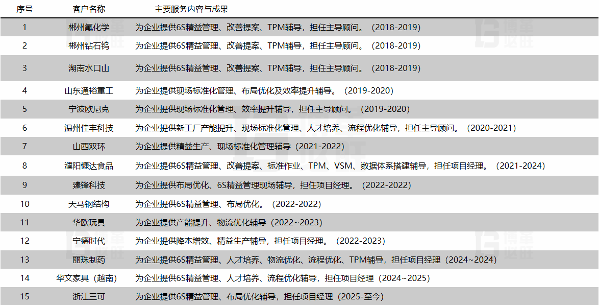擅長業務:對企業降本增效,企業精益人才培養,流程優化,品質改善,6S精益管理等,具備豐富的實戰經驗。擅長幫助企業建立完善的精益體系,運用QCC、VSM等精益管理方法,幫助企業達成PQCD改善目標。專注務實,是落地式精益管理的踐行者。
