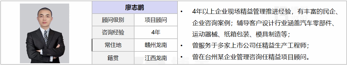 擅長業(yè)務(wù):工廠前期調(diào)研診斷、項(xiàng)目管理、現(xiàn)場基礎(chǔ)管理提升、精益布局規(guī)劃、大型倉儲(chǔ)規(guī)劃、改善項(xiàng)目落地、IE改善手法、質(zhì)量管理、QCD降本增效改善、精益生產(chǎn)配送管理、精益生產(chǎn)項(xiàng)目的推進(jìn)、標(biāo)準(zhǔn)工時(shí)開發(fā)、SMED快速換模換線、現(xiàn)場5S改善、與目視化提升、基層培養(yǎng)-打造班組管理、精益體系建立及改善輔導(dǎo)實(shí)施跟進(jìn),KAIZEN持續(xù)改善、流程再造,3P、定制化生產(chǎn)線搭建,非標(biāo)工裝自動(dòng)化設(shè)備開發(fā)與導(dǎo)入。