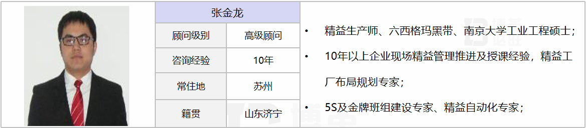 熟悉行業(yè):家電裝配、工程機(jī)械、機(jī)械加工、電子電器、裝備制造 擅長業(yè)務(wù):擅長精益工廠布局規(guī)劃、5S及金牌班組建設(shè)、信息化可視化管理,推動精益項目實施快速改善,短期內(nèi)改善生產(chǎn)現(xiàn)場,優(yōu)化工藝流程及工藝布局\推動全員改善。有豐富的精益項目實戰(zhàn)推進(jìn)經(jīng)驗、推動精益項目在企業(yè)整體落地、現(xiàn)場標(biāo)準(zhǔn)化改善、生產(chǎn)效率提升、布局優(yōu)化、培訓(xùn)道場策劃及實施等、負(fù)責(zé)30+個工廠精益項目的推進(jìn)與運(yùn)營,具有豐富的精益咨詢經(jīng)驗。