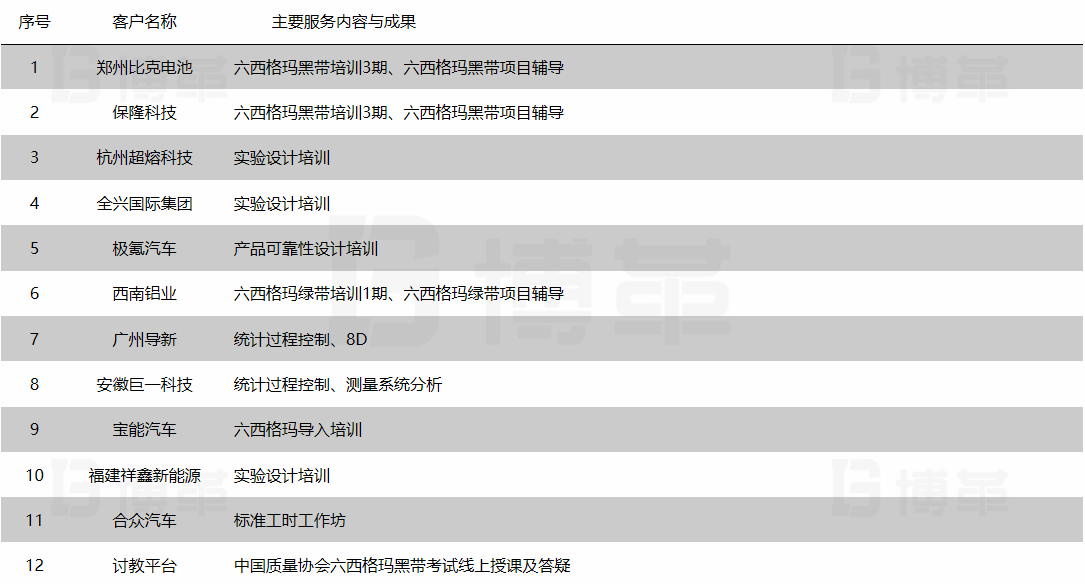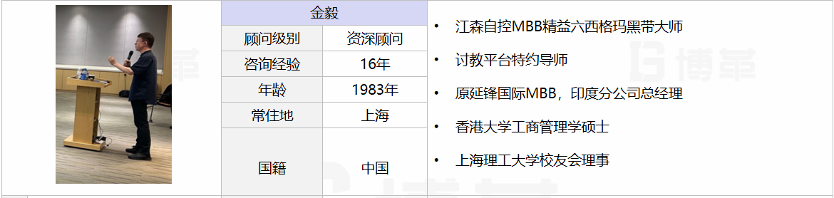 咨詢能力介紹 20年歐美企業(yè)工作經驗,負責眾多 6Sigma項目和其他改善活動; 培訓及輔導企業(yè):極氪汽車、寶能汽車、比克電池、保隆科技、全興國際、巨一動力、合眾汽車、超熔科技等; 成功輔導超過近百名黑帶和六百多名六西格瑪綠帶。曾為中國多家知名企業(yè)及國際化集團公司導入近百個六西格瑪改善項目;累計為企業(yè)帶來超過近千萬的改進收益;