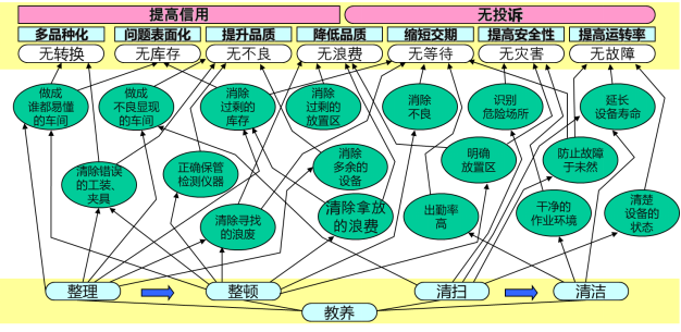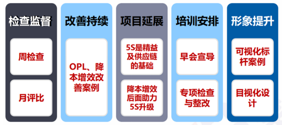 改善持續(xù)性的保證、領(lǐng)導(dǎo)表率、逐漸有序培訓(xùn)、全員參與、自動(dòng)自發(fā)、讓5S變成企業(yè)的一種基本素質(zhì)、基本工具、精益管理的基本功.