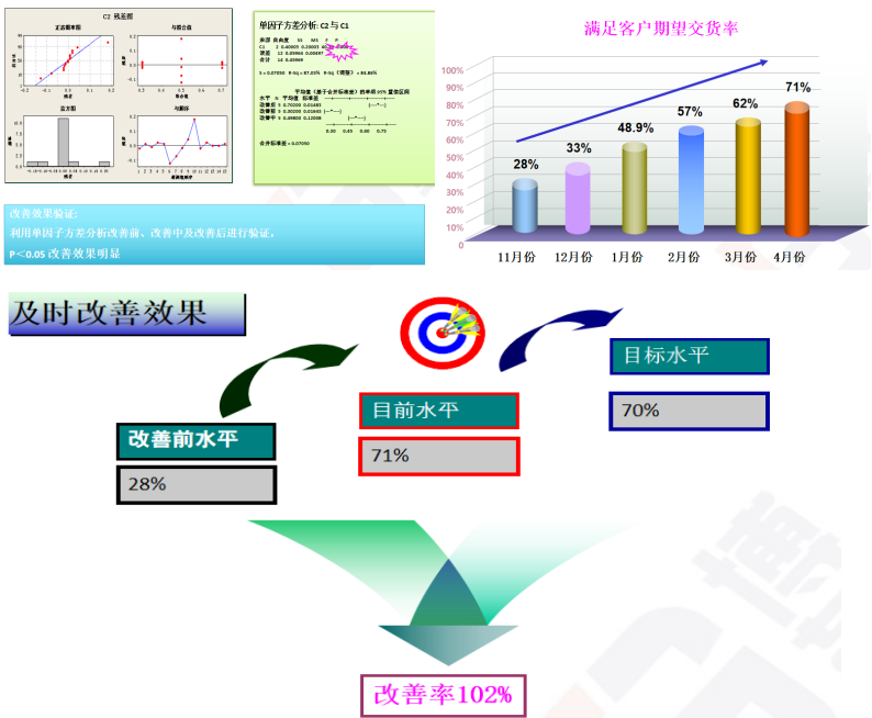 我們項目小組經過為期6個月的努力,按照六西格瑪DMAIC的流程,有效的提銷售部、信用部、生產部之間的銜接效率,并取得了優異的成績,縮短了公司的運轉周期,客戶期望的交付率由原來的28%提高到71%。 在項目的實施過程中,讓我們對6西格瑪有了新的認識: