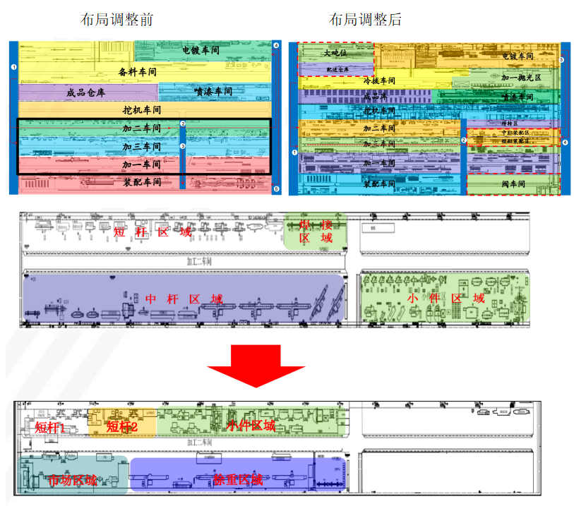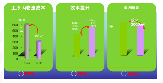 1)精益布局調整,調整后,物流成本降低50%,效率提升30%,面積占用降低15%。
