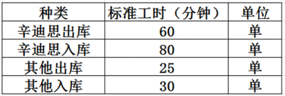l 標準工時由目前的入庫每單110分鐘(辛迪思和其他)減少為95分鐘,降低13.6%;出庫每單85分鐘減少為70分鐘,降低17.6%;