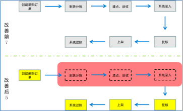 關鍵過程為:采購下單——到貨驗收——出具驗收單——錄入、打單——入庫、上架