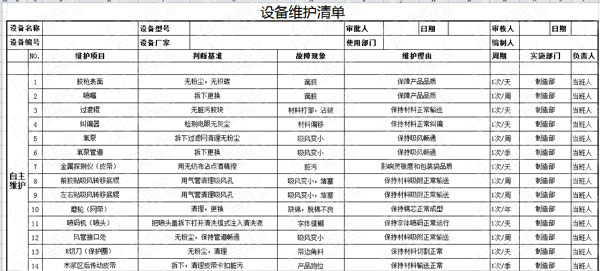 在自主與專業(yè)維護(hù)清單完成后,根據(jù)設(shè)備故障的判斷基準(zhǔn)、故障現(xiàn)象、維護(hù)的周期、維護(hù)的部門和責(zé)任人,制定自主與專業(yè)維護(hù)清單。
