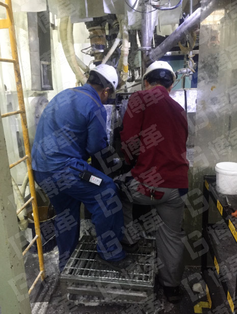 三、清掃共分兩組進(jìn)行,對加料口正面和背面做清掃,并按步驟先對加料口、加料口導(dǎo)流槽、廢料收集槽等進(jìn)行清理