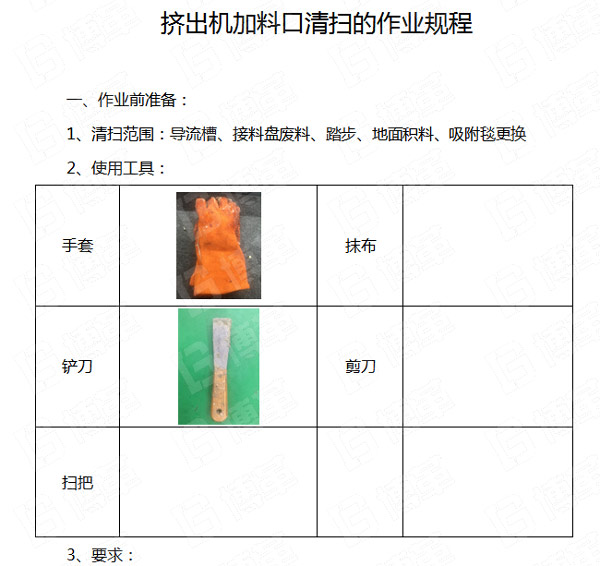五、通過本次清掃的活動,和員工交流和討論,形成了加料口的清掃作業(yè)規(guī)程,作業(yè)規(guī)程共分:作業(yè)前準(zhǔn)備、作業(yè)過程、作業(yè)后確認(rèn)等三個步驟。