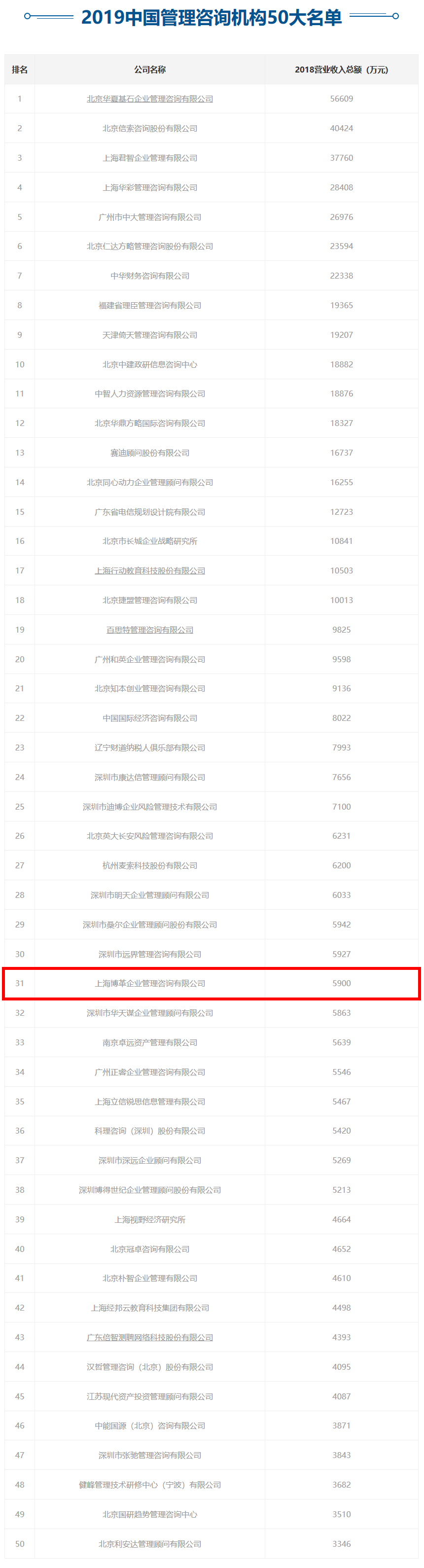 2020年1月10日,中國(guó)企業(yè)聯(lián)合會(huì)管理咨詢委員會(huì)、中國(guó)企業(yè)聯(lián)合會(huì)培訓(xùn)工作委員會(huì)、企業(yè)管理雜志社聯(lián)合發(fā)布了“2019中國(guó)管理咨詢機(jī)構(gòu)50大名單”(詳見(jiàn)附圖)。上海博革企業(yè)管理咨詢有限公司(簡(jiǎn)稱(chēng)博革咨詢)名列其中,位列第31位。