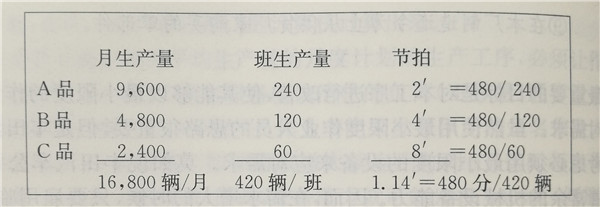 在這里,節(jié)拍時(shí)間是用一個(gè)班也就是480分鐘的生產(chǎn)量去除一個(gè)班的時(shí)間480分鐘得出的。根據(jù)這個(gè)計(jì)算結(jié)果,A品2分鐘生產(chǎn)一輛,B品4分鐘生產(chǎn)一輛,平均下來(lái)用1.14分鐘生產(chǎn)一輛即可。